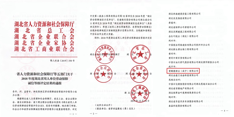 黃鶴樓酒業(咸寧)有限公司獲評2018年度 “湖北省勞動保障誠信示范單位”