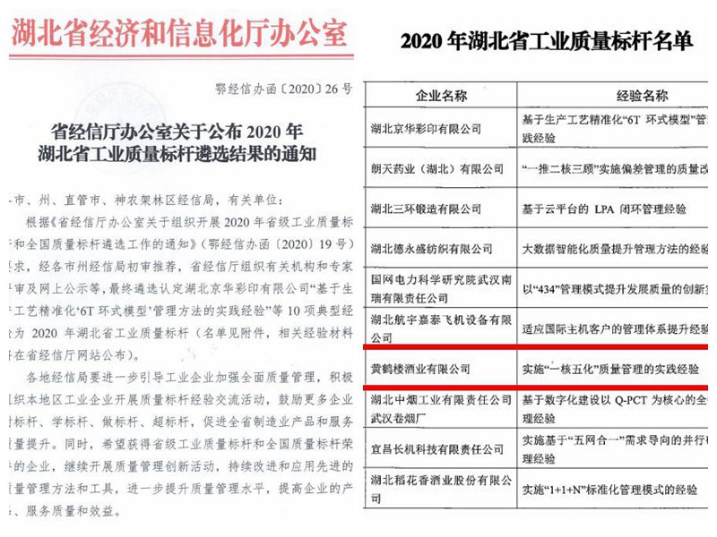 近日,湖北省經信廳公布2020年湖北省工業質量標桿遴選結果,黃鶴樓酒業提報的“實施‘一核五化’質量管理的實踐經驗”榮獲湖北省質量標桿。