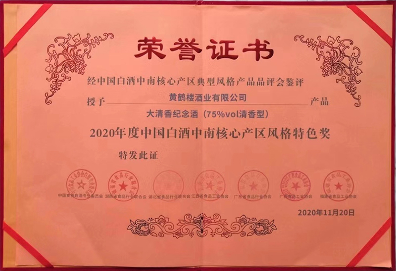 峰會還舉行了中南核心產區典型風格產品品評會,黃鶴樓酒業大清香紀念酒(75%vol清香型)榮獲風格特色獎。