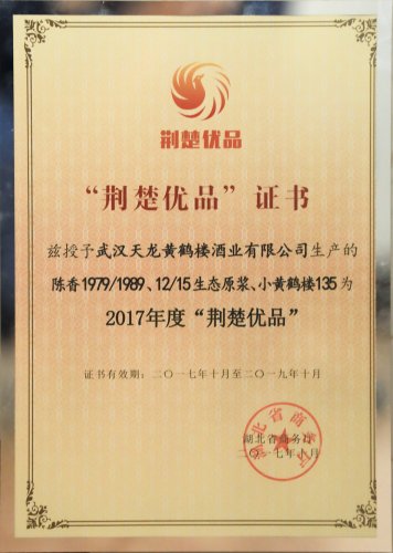 會上,武漢市共有8家企業產品被省商務廳授予“荊楚優品”,其中,黃鶴樓酒業生產的陳香1979/1989、12/15生態原漿、小黃鶴樓135等五種產品獲評2017年度“荊楚優品”。