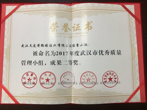 近日,武漢天龍黃鶴樓酒業有限公司陳香小組榮獲2017年度武漢市優秀質量管理小組成果二等獎、清香小組榮獲2017年度武漢市優秀質量管理小組。陳彥龍、楊威榮獲2017年度武漢市質量管理小組活動優秀推進者。