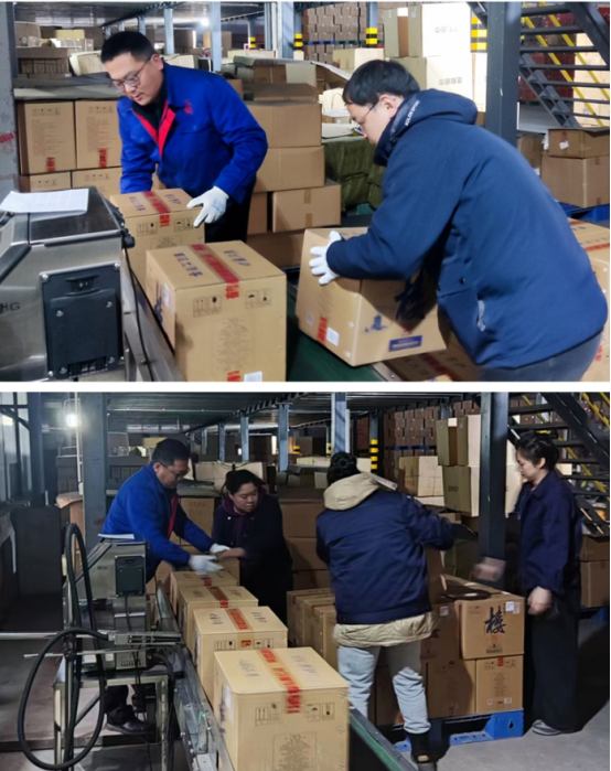 歲末年關,市場需求擴大,訂單激增,待噴字發貨的成品酒每天達上千件,生產黨支部響應號召,組成一支由黨員先鋒帶頭的噴字隊伍深入生產一線。時間緊,任務重,黨員、積極分子、團員為一箱箱成品酒噴上客戶名,現場人員各司其職,齊心協力,以實際行動踐行一切服務銷售,助力旺季攻堅戰。