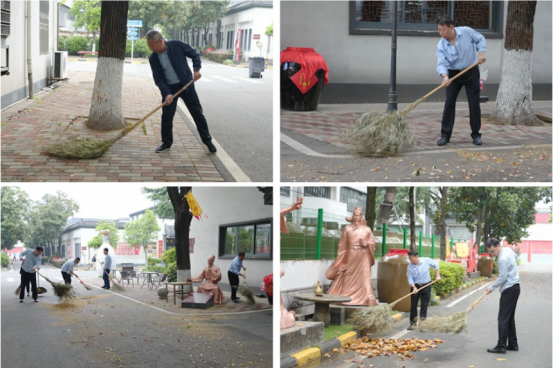 清晨八時許,行政黨支部黨員們拿起笤帚、撮箕,對昨日風雨過后的殘枝落葉等進行清理。