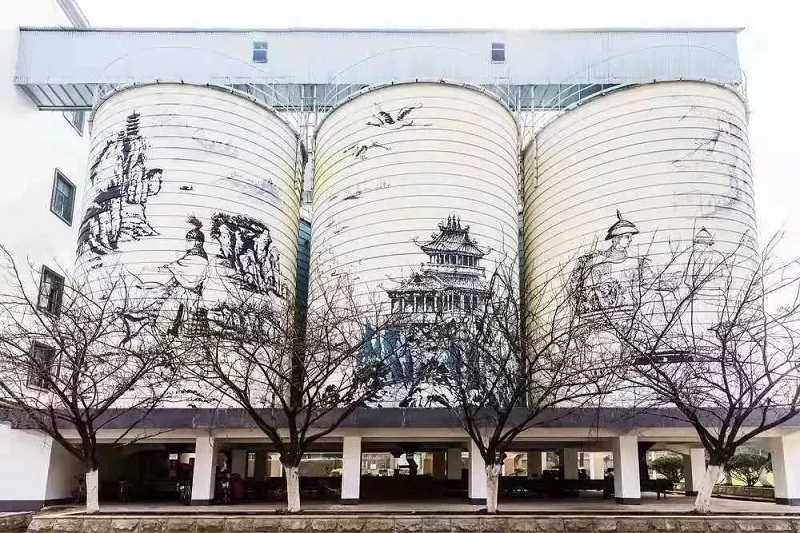 御酒糧倉是黃鶴樓酒業(yè)生產(chǎn)用糧的存儲庫,糧倉外部的彩繪分別為《周瑜江夏練兵用酒圖》《黃鶴樓仙酒傳說圖》《張之洞進(jìn)獻(xiàn)用酒圖》,展示了黃鶴樓酒文化的起源與發(fā)展。
